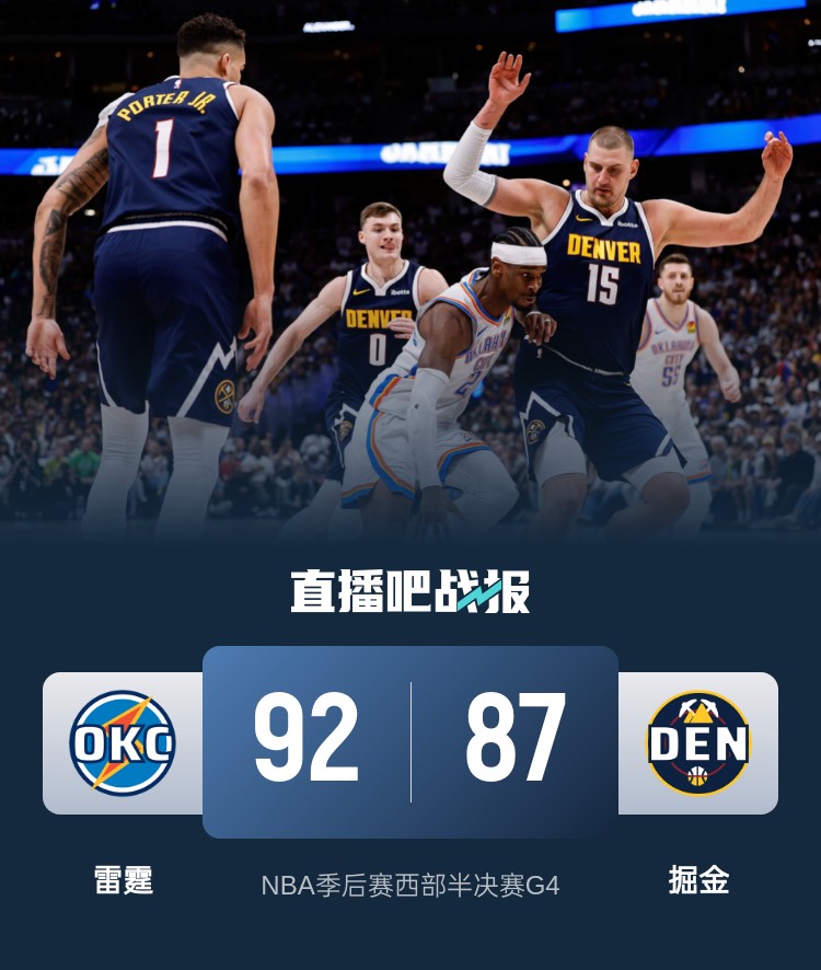 5月12日讯 NBA季后赛西部半决赛G4,掘金继续主场迎战雷霆。上一场比赛,掘金加时苦战战胜雷霆,目前大比分2-1领先。