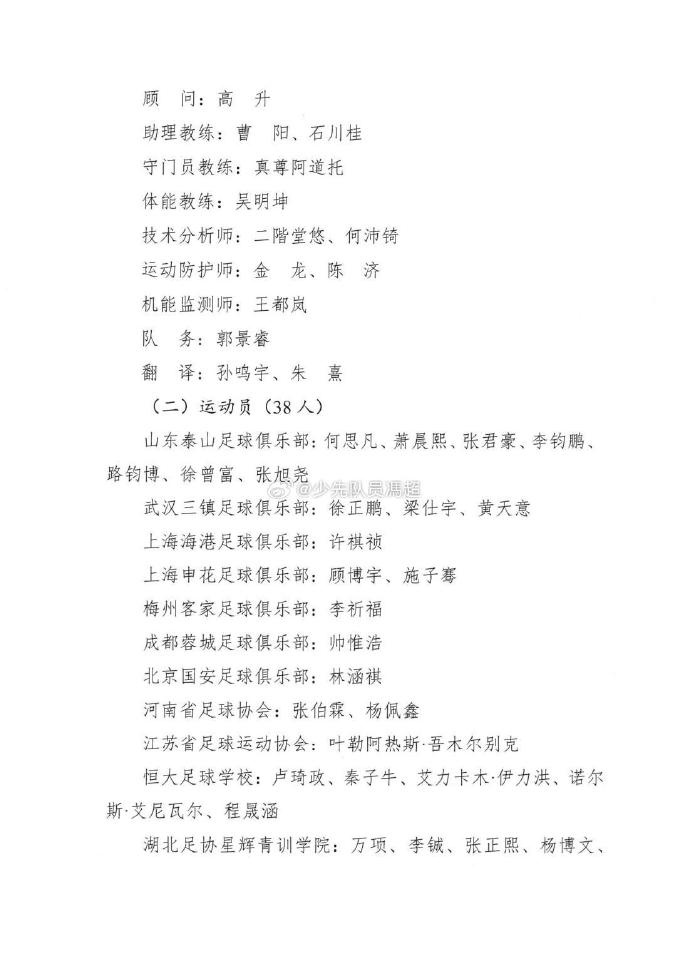 U16国足集训名单:邝兆镭、谢晋、万项、卢琦政在列,泰山7人